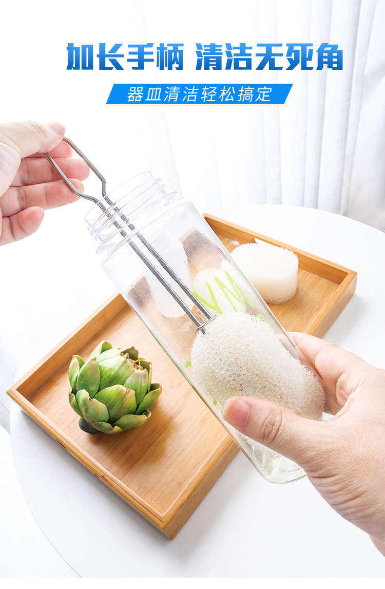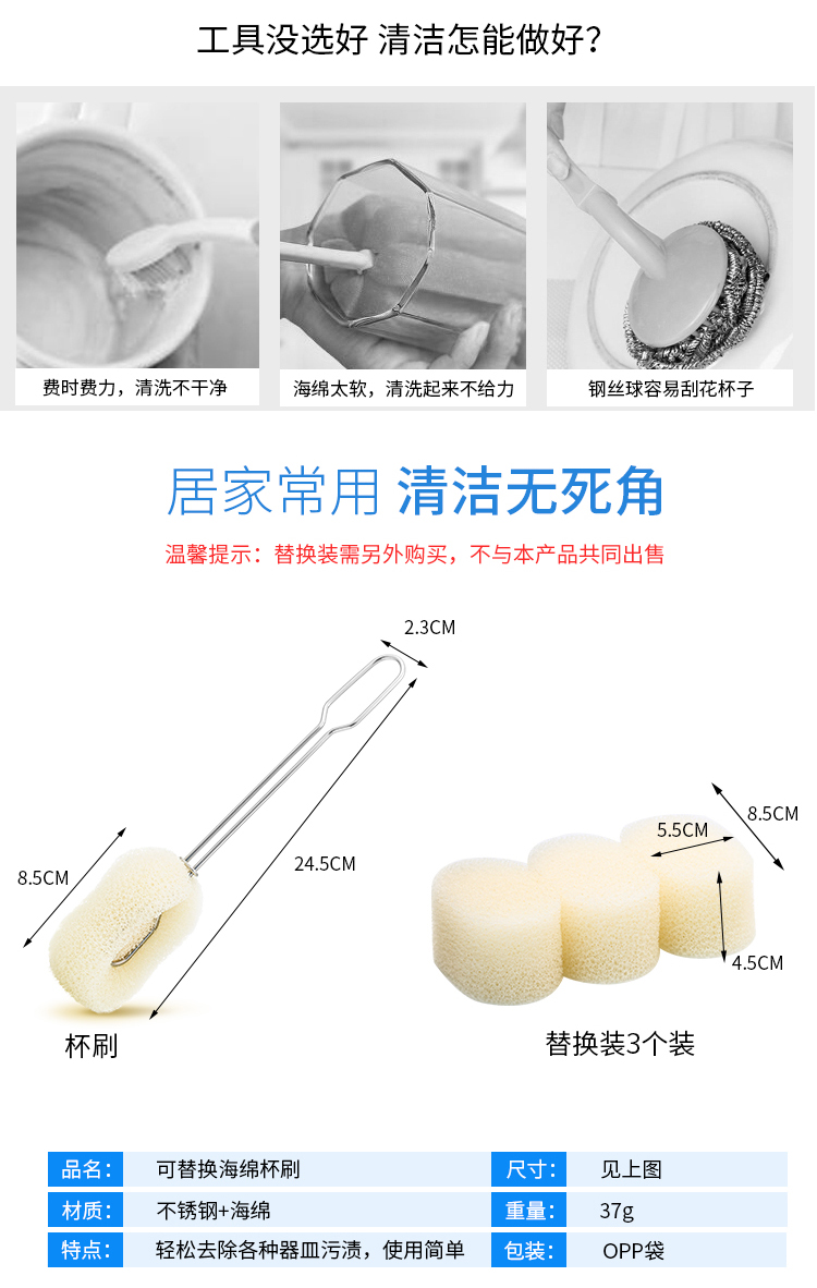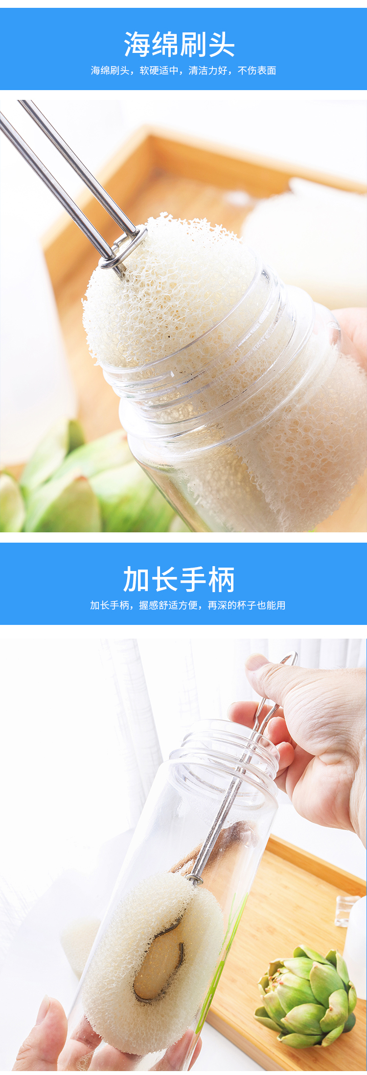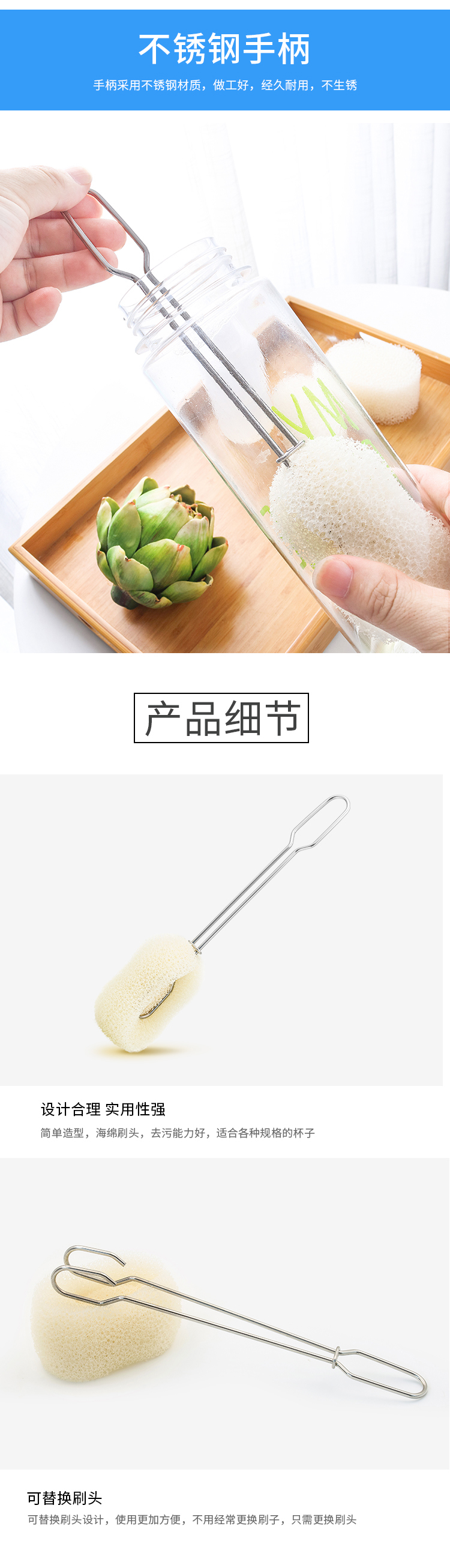 不锈钢手柄强力去污可替换刷头海绵杯刷可拆奶瓶刷玻璃杯清洁刷家居长柄海绵茶杯刷子洗杯子神器水壶刷子